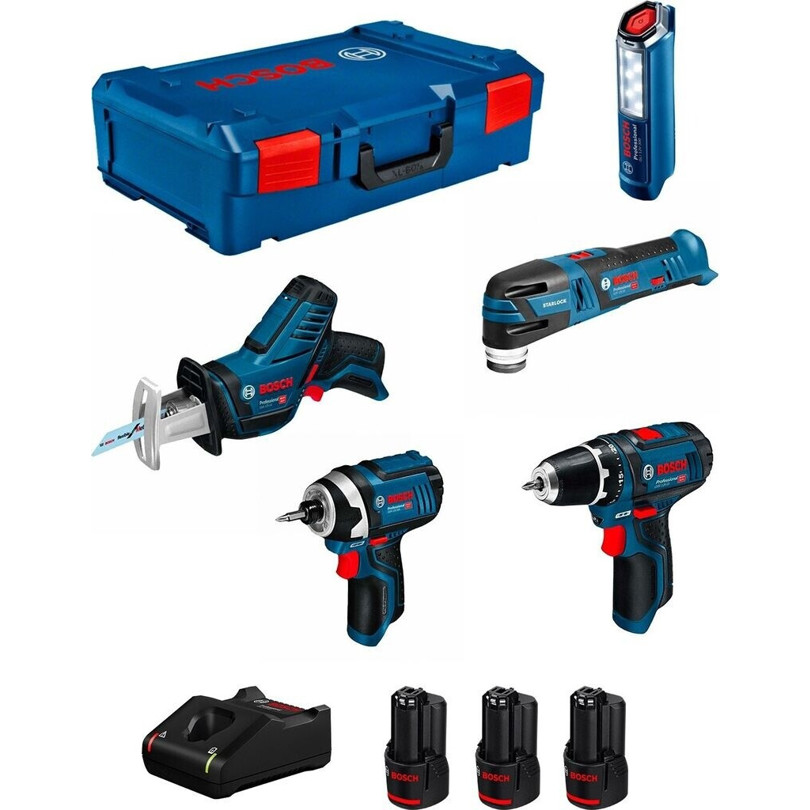 Das Set beinhaltet ein Akku-Multifunktionswerkzeug (GOP 12V-28), einen Akku-Drehschlagschrauber (GDR 12V-105), eine Akku-Säbelsäge (GSA 12V-14), einen Akku-Bohrschrauber (GSR 12V-15) sowie eine LED-Taschenlampe.