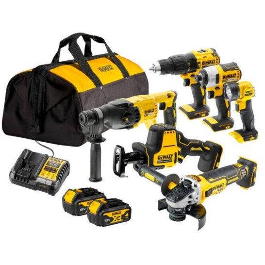 Das Set beinhaltet einen Akku-Bohrhammer, Akku-Schlagbohrschrauber, Akku-Schlagschrauber, Akku-Winkelschleifer, Akku-Säbelsäge und eine Akku-LED Taschenlampe.