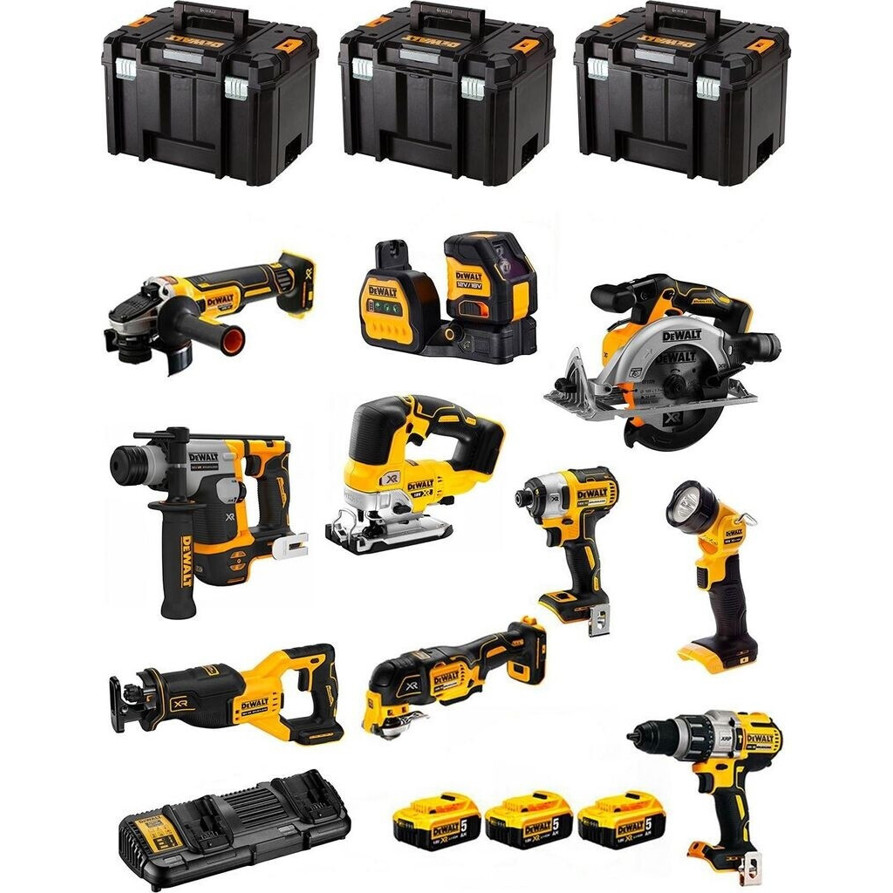 Es beinhaltet unter anderem Akku-Schraubendreher, Schlagschrauber, Kreissäge, Reciprosäge, Multitool, Stichsäge, Kombihammer, Winkelschleifer, Kreuzlinienlaser und Arbeitsscheinwerfer.