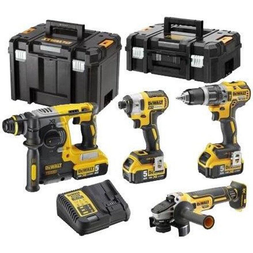 Dieses umfangreiche Set beinhaltet einen Akku-Schlagbohrschrauber, einen Akku-Kombihammer, einen Akku-Schlagschrauber und einen Akku-Winkelschleifer. Damit sind Sie bestens ausgestattet für Aufgaben wie Hammerbohren, Trennen, Schlagschrauben, Schlagbohren, Bohren, Schleifen und Stemmen. Die Akku-Maschinen DCD796, DCH273, DCF887 und DCG405 sind für ihre Zuverlässigkeit und Leistung bekannt.