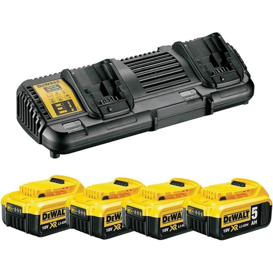 Das Set wird mit vier 18 V Akkus, jeweils mit einer Kapazität von 5 Ah, sowie einem passenden Ladegerät geliefert.