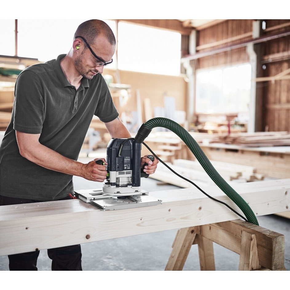 Für eine saubere Arbeitsumgebung sorgt der Anschluss für eine Staubabsaugung mit einem Durchmesser von 36 mm. Das Gesamtgewicht des Geräts beträgt 7,8 kg, was eine gute Balance zwischen Handlichkeit und Stabilität bietet. Im Lieferumfang der Festool OF 2200 EB-Plus sind ein Kopierring, ein Seitenanschlag sowie ein praktischer Systemkoffer enthalten, der den Transport und die Lagerung erleichtert. Diese Oberfräse ist die ideale Wahl für Profis, die Wert auf Leistung, Präzision und Zuverlässigkeit legen.