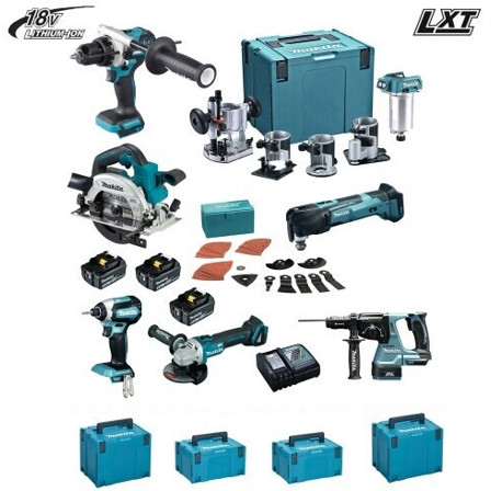 Das Set beinhaltet eine umfassende Auswahl an Elektrowerkzeugen, darunter einen Akku-Winkelschleifer (DGA506), Akku-Kombihammer (DHR243), Akku-Handkreissäge (DHS660), Akku-Schlagschrauber (DTD153), Akku-Multifunktionswerkzeug (DTM51), Akku-Fräse (DRT50) und einen Akku-Schlagbohrschrauber (DHP486). Diese Maschinentypen decken Einsatzbereiche wie Hammerbohren, Trennen, Schlagschrauben, Schrauben, Schlagbohren, Fräsen, Bohren, Sägen, Schleifen und Stemmen ab, sodass für jede Aufgabe das richtige Werkzeug zur Hand ist. Das gesamte Set wird im praktischen Makpac 4 Koffer geliefert, der für den sicheren Transport und die ordentliche Aufbewahrung sorgt.