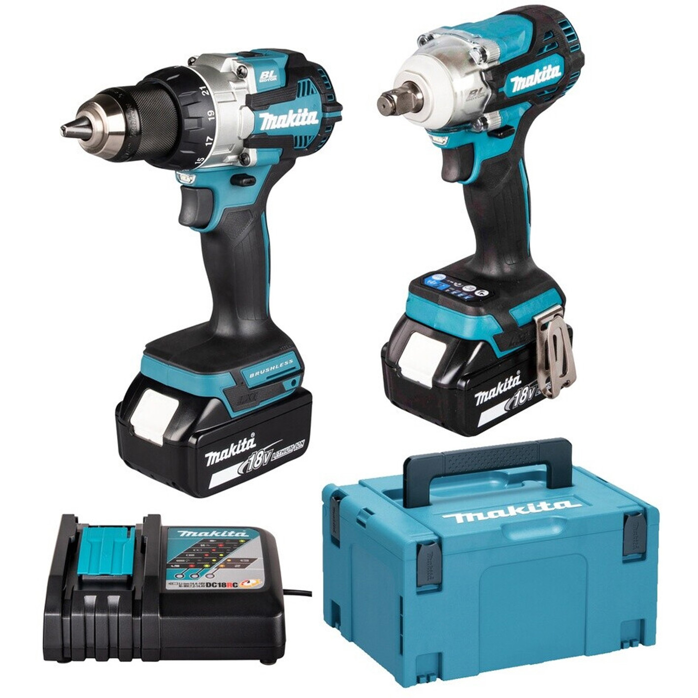 Im Set sind ein Akku-Bohrschrauber (DDF489Z), ein Akku-Schlagschrauber (DTW300Z), zwei 18 V Li-Ion Akkus mit 5 Ah, ein Ladegerät sowie ein Makpac Koffer enthalten.