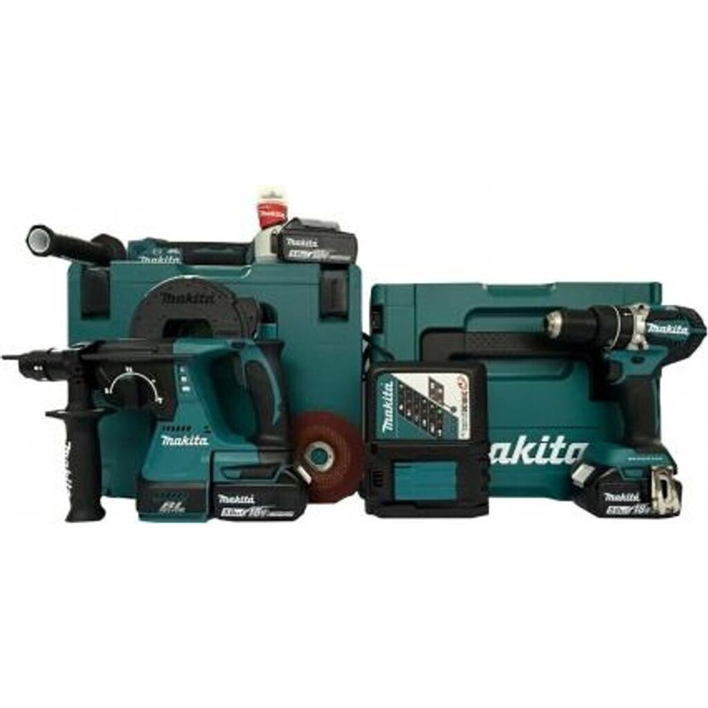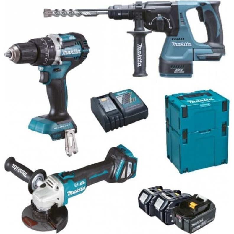 Das Set beinhaltet einen Akku-Schlagbohrschrauber (DHP484), einen Akku-Winkelschleifer (DGA513) und einen Akku-Kombihammer (DHR243) der Marke Makita.