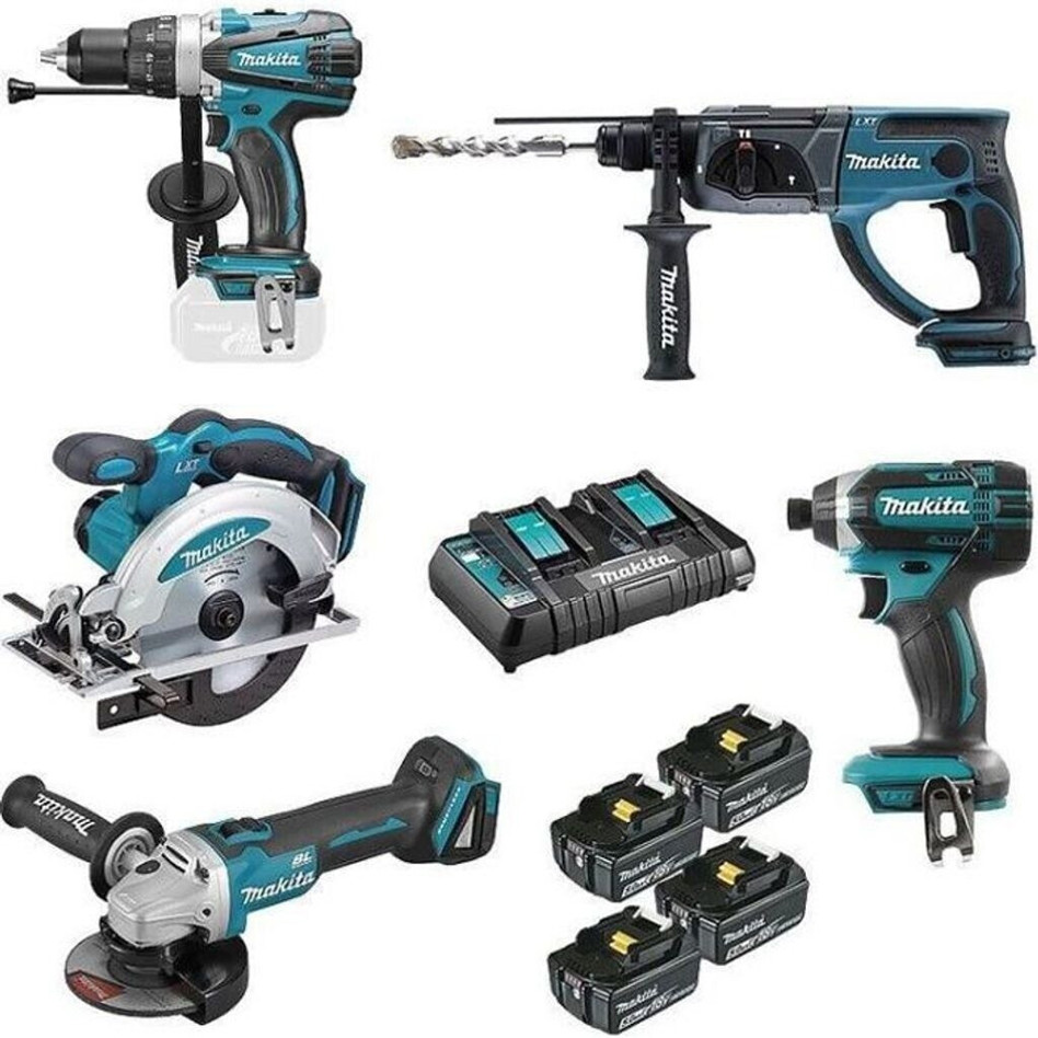 Das Set beinhaltet eine Akku-Kreissäge, einen Akku-Schleifer, einen Akku-Schlagbohrschrauber, einen Meißelhammer und einen Akku-Schlagschrauber.