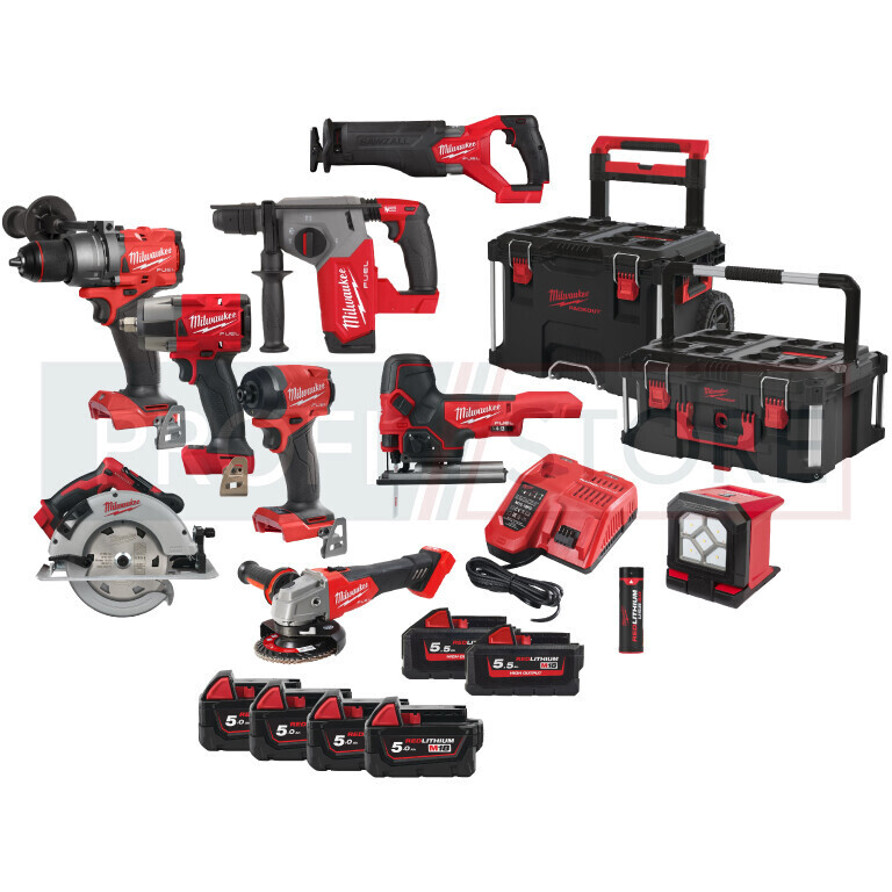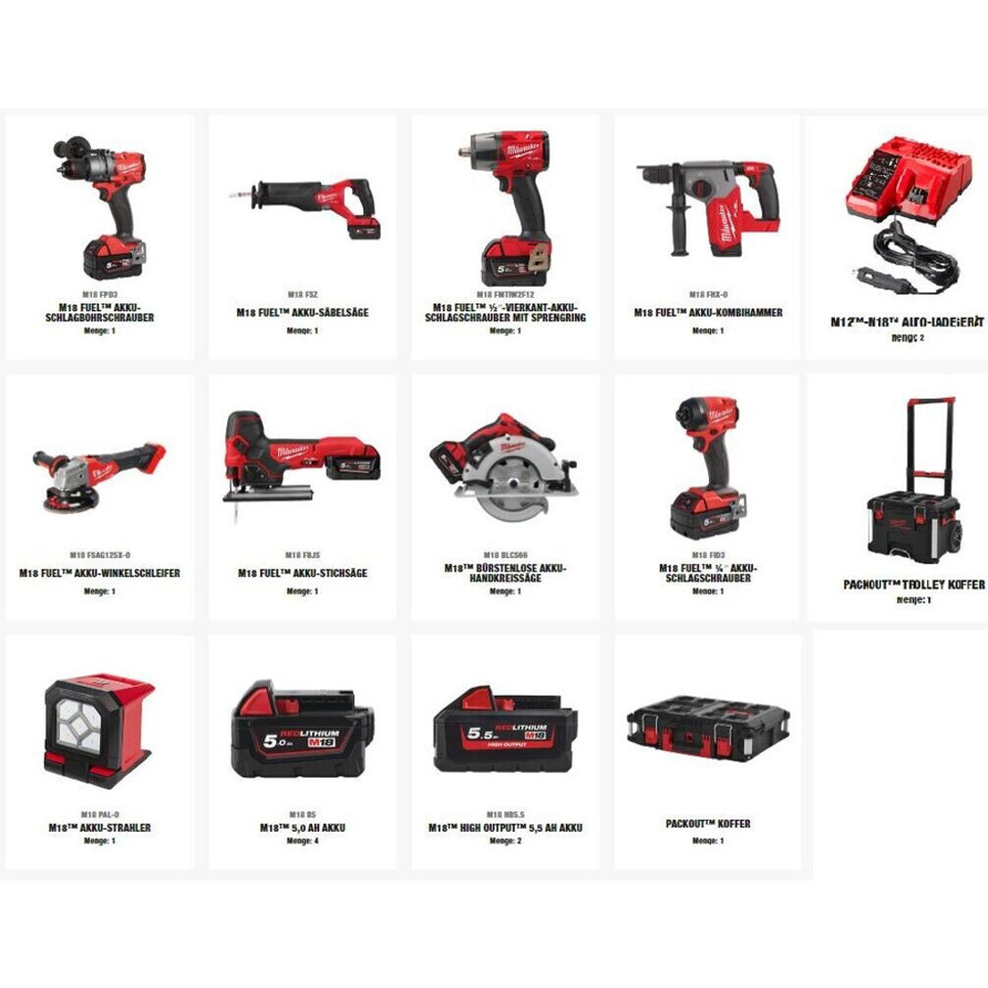 Im Lieferumfang des Milwaukee M18FPP9A-555T sind zahlreiche Elektrowerkzeuge enthalten, darunter ein Akku-Schlagschrauber, eine Akku-Säbelsäge, ein Akku-Bohrschrauber, ein Akku-Kombihammer, ein Akku-Winkelschleifer, eine Akku-Stichsäge, eine Akku-Handkreissäge, ein Akku-Schlagbohrschrauber und ein Akku-Strahler. All diese Werkzeuge sind für die Akkuspannung von 18 V ausgelegt und bieten eine hohe Leistung und Flexibilität.