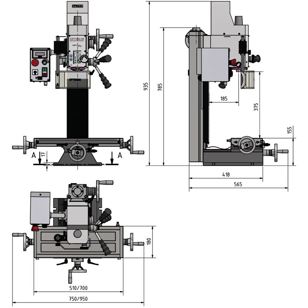 Produktinformationen "Optimum - OPTI BF 20 L Vario - Bohr-Fräsmaschine - 850 W, 115 kg, 50 mm Fräskorbhub"